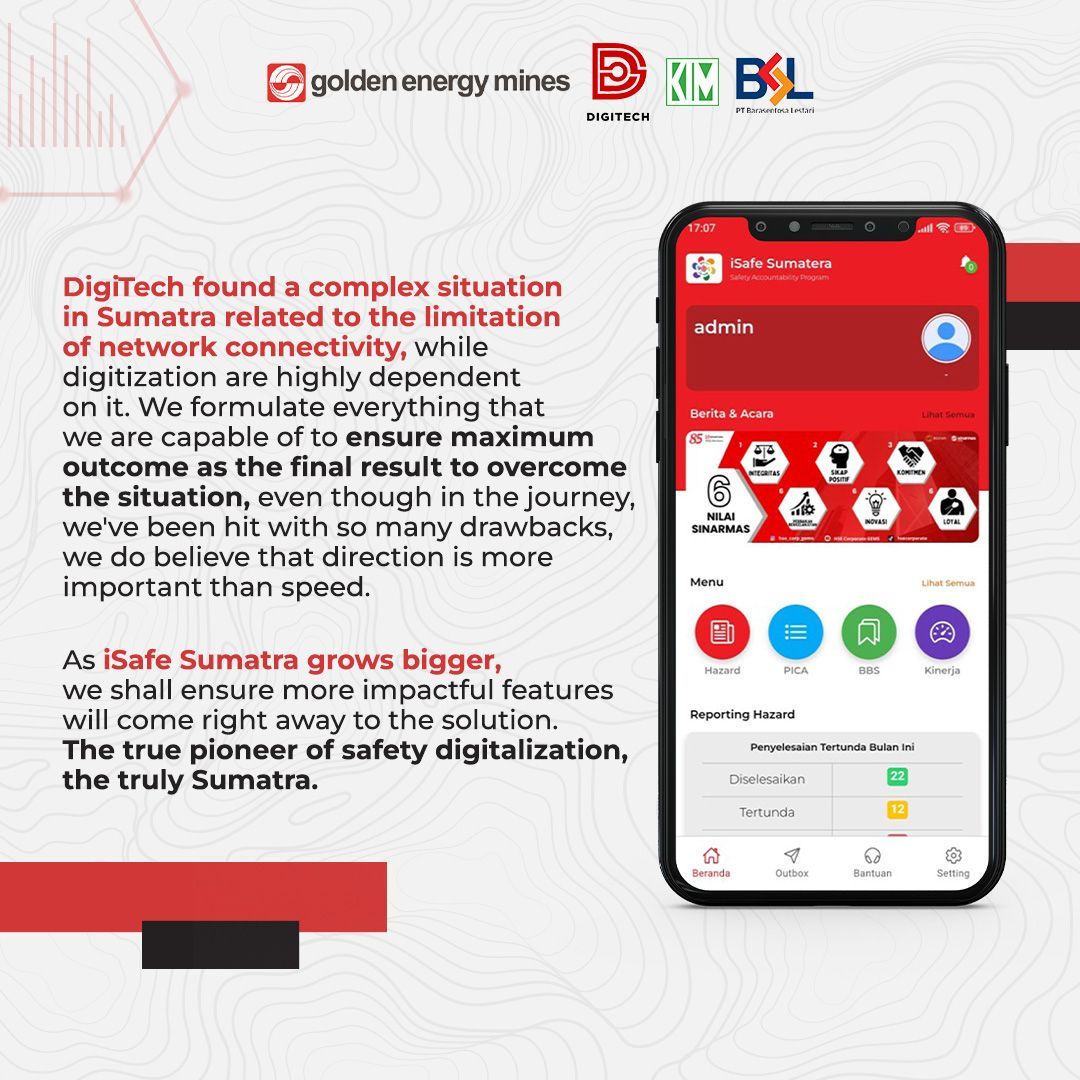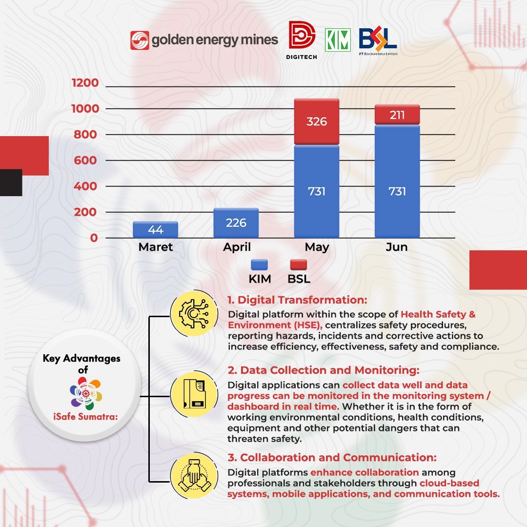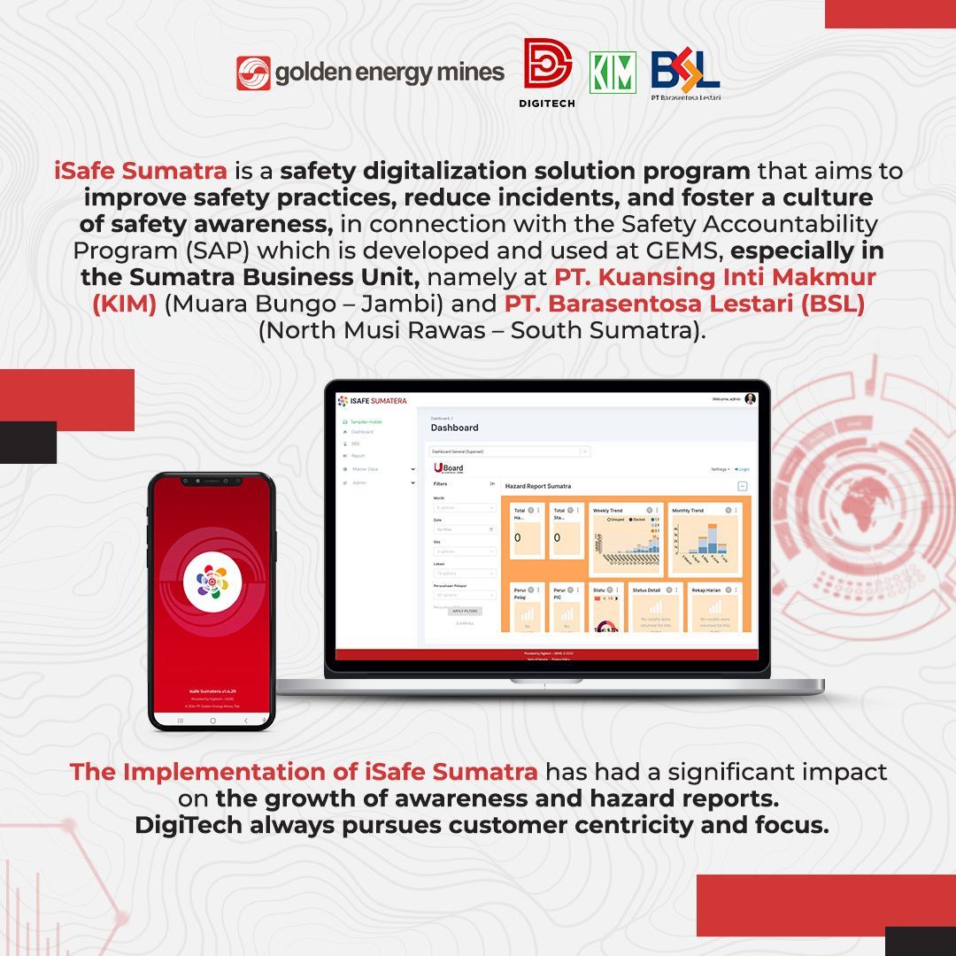 GEMS and DigiTech’s commitment to implementing collective progress across all business units can be seen in the iSafe Sumatra application. Berlian Hasbullah as Head of Upstream Business Advisory said, this application focuses on digitizing safety monitoring, operational efficiency, and compliance with regulatory standards, especially for site operational areas at KIM and BSL. The successful implementation of the iSafe application does not escape the involvement of all stakeholders. In the future, iSafe will continue to develop its features to make them more optimal. #TechConnect #GoldenEnergyMines #GEMS #iSafe #SafetyMonitoringApplication