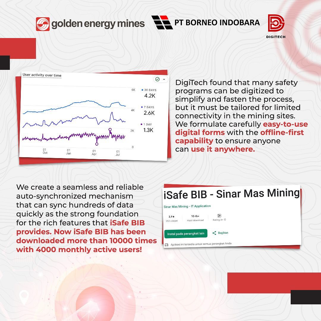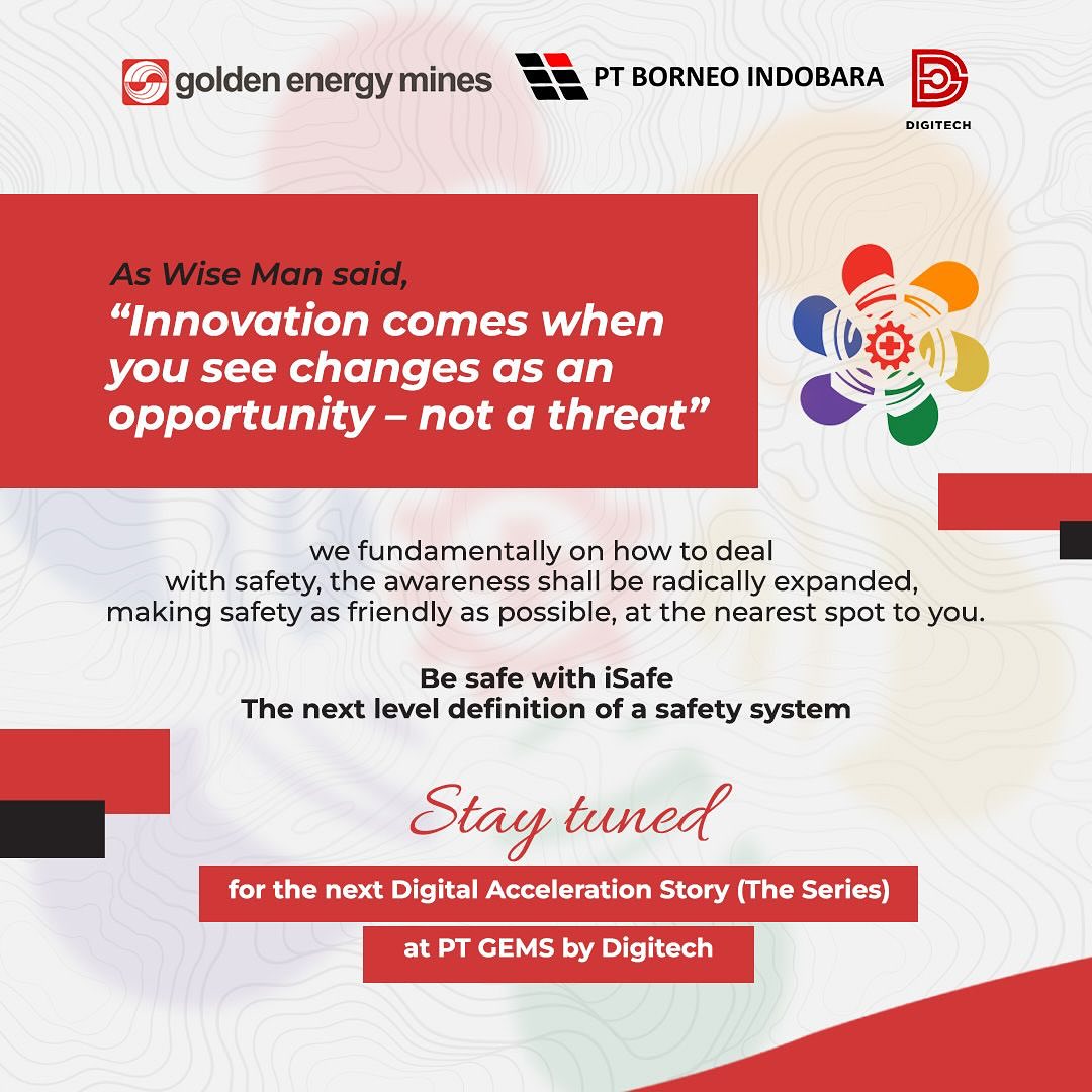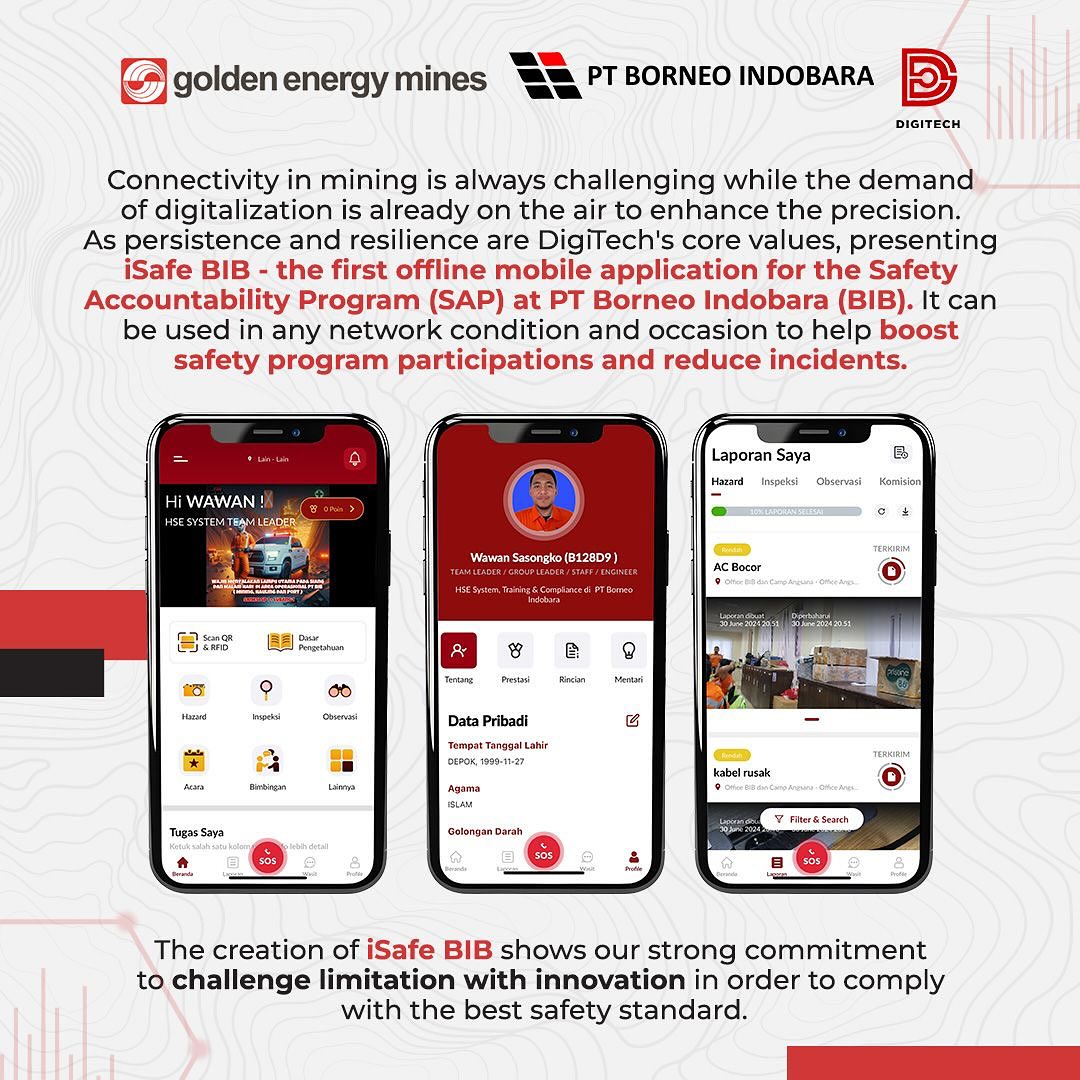 DigiTech’s commitment to complying with the best safety standards at PT Borneo Indobara (BIB) is outlined in the iSafe BIB application. Tijani Rijal Fadhilah as an Engineering Expert explained that the first offline mobile application for the safety accountability program is also integrated with our machine learning platform (INSTING) and the CCTV analytic platform (SiCantik). This safety monitoring digitalization program can be used anywhere and at any time, to support high safety awareness for all employees. #TechConnect #GoldenEnergyMines #GEMS #BorneoIndobara #BIB #iSafe #SafetyApplication