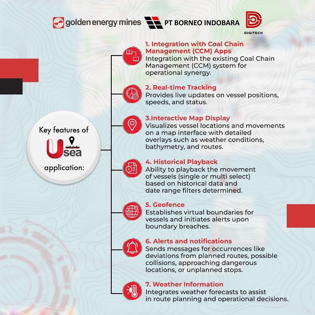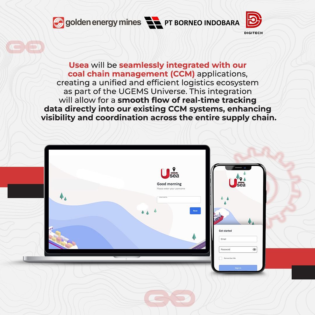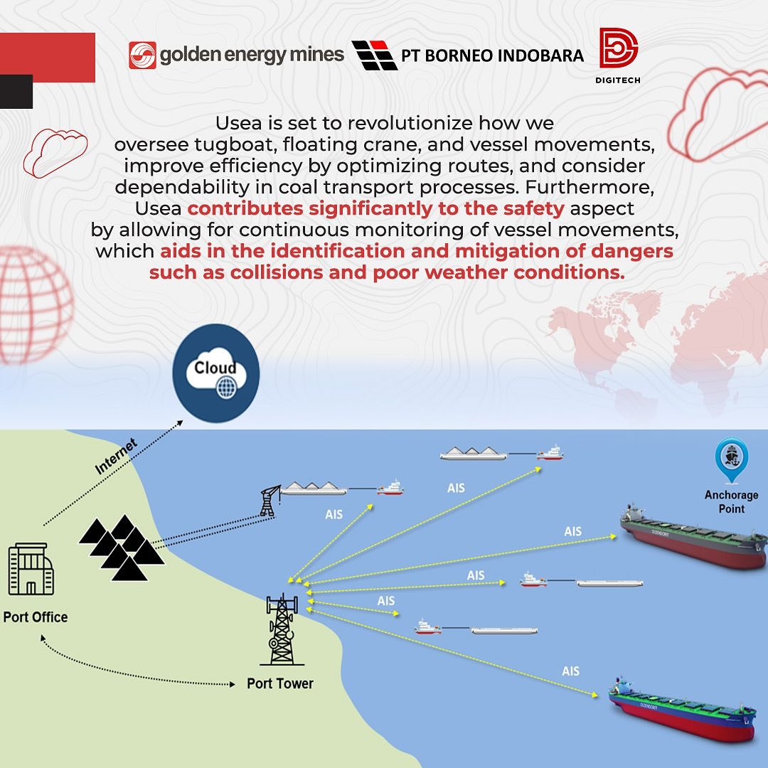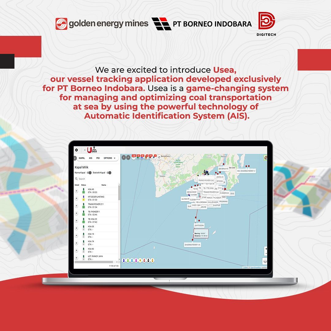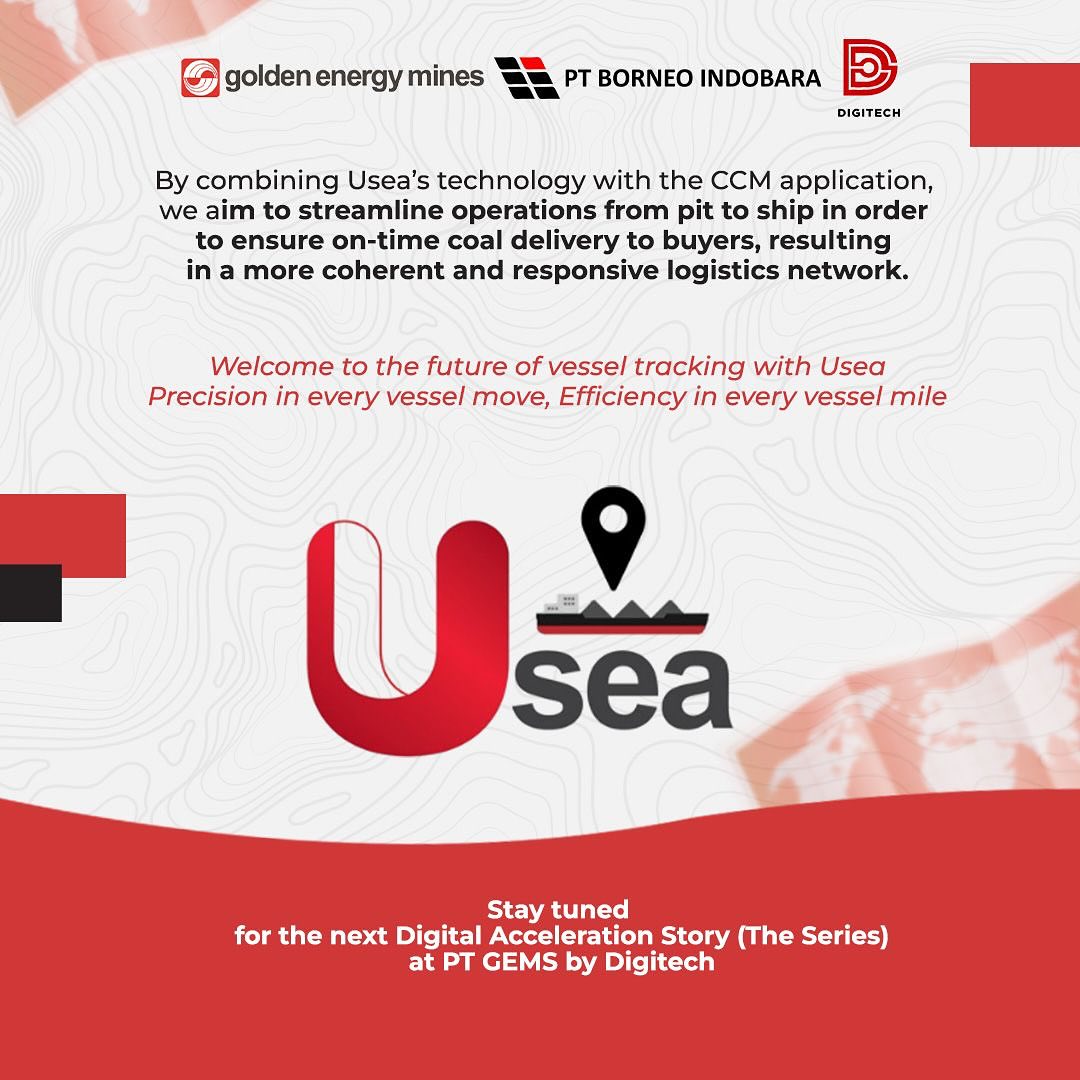 Excellent transportation and logistics are critical to maintaining operational efficiency and ensuring product delivery on time. To meet the objective, DigiTech presents Usea – our vessel tracking application developed exclusively for PT Borneo Indobara (BIB). Delza Dera Nur Hermawan as a Factory Demand Specialist explained that with Usea, managing and optimizing coal transportation at sea becomes very efficient and easy because of the real-time tracking, integrated with CCM applications, weather information, geofancing, and equipped with other beneficial features. By implementing Usea, we can also prioritize safety, and facilitate monitoring of the entire coal delivery process precisely, quickly, and comfortably. #TechConnect #GoldenEnergyMines #GEMS #BorneoIndobara #BIB #DigiTech #Usea